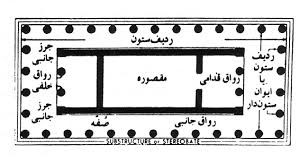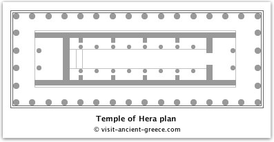 نقشه اغلب معابد یونانی مستطیل شکل بوده و در مرکز آن بخش اصلی معبد نیز یک اتاق مستطیل شکل قرار داشته که آن را مقصوره (نائوس) می نامیدند. تندیس الهه در داخل مقصوره بدون ستون بوده، اما به تدریج یک ردیف ستون برای حمل بار سقف سنگی معبد در دو طرف در امتداد یکدیگر کار گذارده شد. مقصوره دارای ایوان ستون دار قدامی یا پیشین است که در معماری یونان آن را پرونائوس می گویند