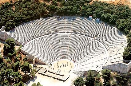 یونانی ها اجتماعات ورزشی بزرگی مانند المپیک داشتند که از قرن هفتم ق.م در بین ورزشکاران دولت شهرهای یونانی برگزار می گردید. همین امر موجب گردید که آنها به ایجاد فضاهای بزرگی نظیر تئاتر مبادرت ورزند. یونانی ها تئاتر را اکثرا در دامنه کوه یا شیب تپه طبیعی به شکل نیم دایره احداث کرده اند که در آغاز مکانی برای “دیونیسوس” خدای شراب، آوازها و رقص هایی را ترتیب دادند که مردم در آن شرکت می جستند. در وسط تئاتر معمولا جایی برای نمایش ها به صورت دایره ساخته شده بود. جایگاه تماشاچیان به صورت پله هایی در سنگ صخره ای ایجاد شده و گاهی روی آن را با روکشی مرمرین فرش نموده بودند.