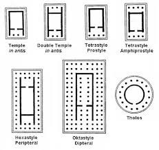 نقشه اصلی بناها چهارگوش بود، به جز چند پرستشگاه که با نقشه مدور ایجاد شده و دورستونی بودند که بهترین نمونه اینگونه بناها معبد تولوس است که در شهر دلفی قرار دارد.